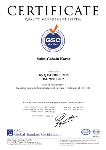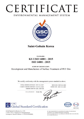 ISO9001 인증을 획득하였으며, 환경경영시스템 ISO14001 인증을 통하여 기업의 환경 영향을 최소화하고 지속 가능한